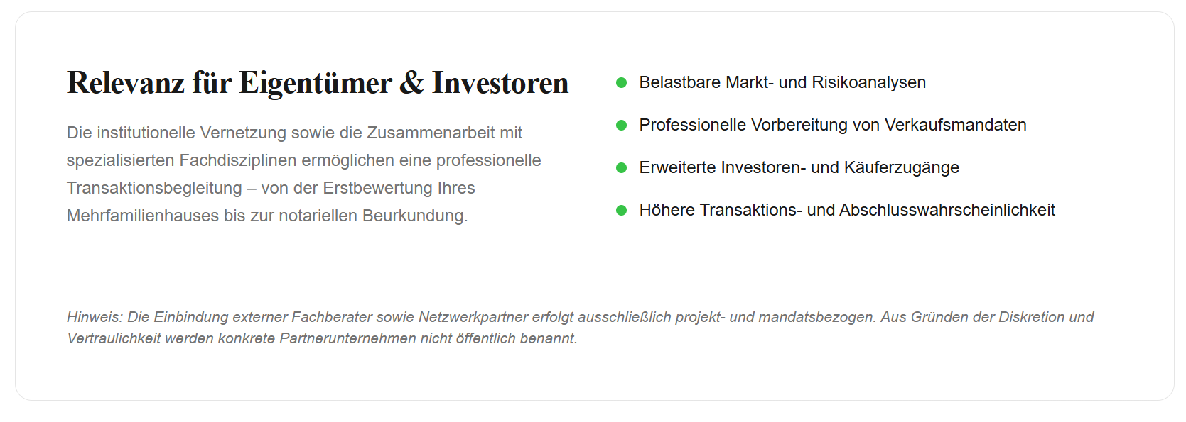 Immobilientransaktionen im Bereich Mehrfamilienhäuser, Zinshäuser und Anlageimmobilien erfordern eine präzise Abstimmung verschiedener Fachdisziplinen. Immoraum agiert innerhalb eines professionellen Beratungs- und Spezialistenumfelds und greift auf ein gewachsenes Netzwerk spezialisierter Fachpartner zurück.
